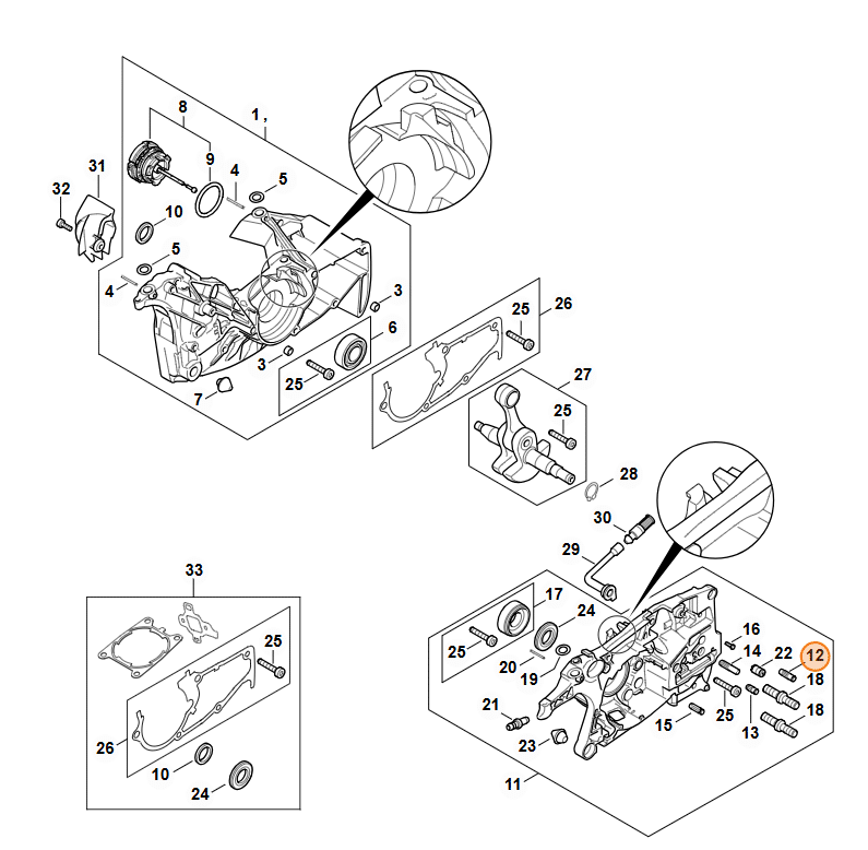 ✅ V zostave kľukovej skrine MS 462 sa nachádza viacero polohovacích prvkov (napr. pozície 12, 13, 14). Každý má svoju špecifickú úlohu pri fixácii kartera. Vždy odporúčame skontrolovať všetky čapy podľa technickej dokumentácie pri každej generálnej oprave.