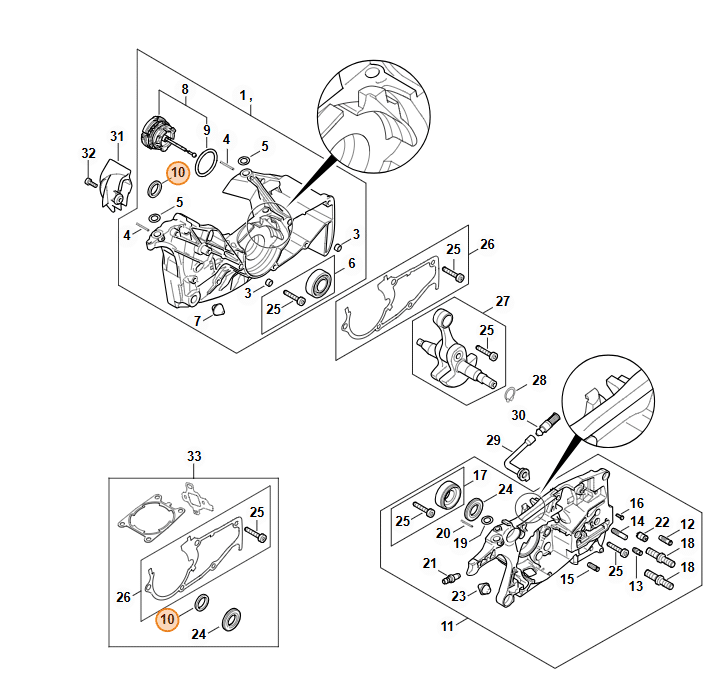 Pri servise kľukovej skrine na STIHL MS 462 nikdy nemeňte len jedno gufero. Hoci môže prepúšťať len strana od spojky, obe tesnenia majú za sebou rovnaký počet motohodín. Vymeňte pozíciu 10 aj pozíciu 24 súčasne. Pri montáži odporúčam použiť originálnu narážaciu objímku STIHL, aby ste tesniacu peru nepoškodili o hranu alebo závit kľukového hriadeľa. Aj mikroskopické natrhnutie pery pri montáži znehodnotí celý diel a povedie k opätovnej netesnosti.