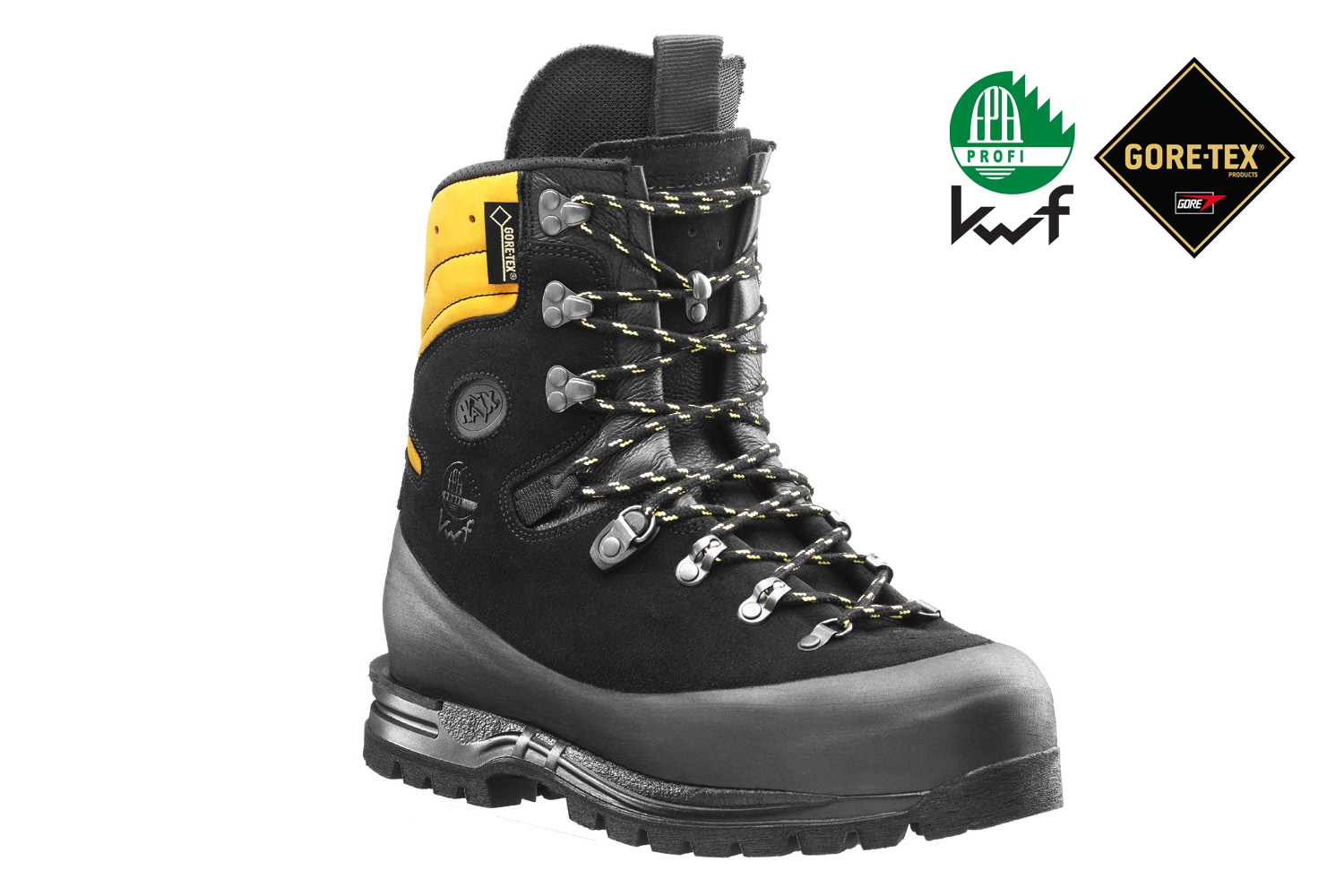 Profesionálna pilčícka obuv Haix Protector Alpin v čierno-žltej farbe.
