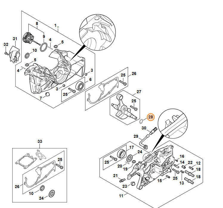 Pri každej demontáži poistného krúžku na STIHL MS 462 (pozícia 28) dôrazne odporúčam použiť vždy nový kus. Aj keď sa starý krúžok zdá byť v poriadku, pri jeho rozťahovaní kliešťami dochádza k mikroskopickej únave materiálu a strate pôvodného predpätia. Použitie „unaveného“ krúžku na kľukovom hriadeli, ktorý rotuje rýchlosťou cez 200 otáčok za sekundu, je hazardom. Pred montážou nového krúžku sa uistite, že drážka na hriadeli je absolútne čistá a zbavená zvyškov živice alebo kovových pilín, aby krúžok mohol plne „zaskočiť“ po celom obvode.