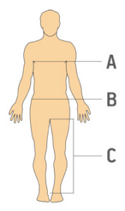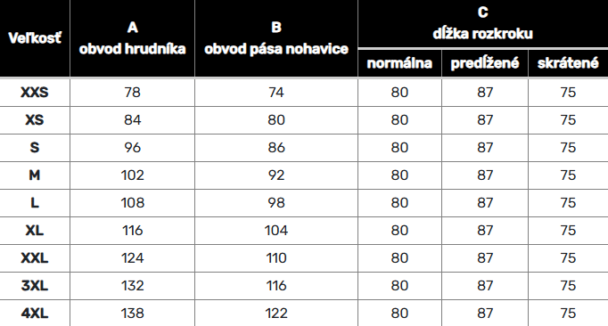 | Veľkosť | A – Obvod hrudníka (cm) | B – Obvod pása (cm) | C – Dĺžka rozkroku (Normálna) | C – Dĺžka rozkroku (Predĺžená) | C – Dĺžka rozkroku (Skrátená) |