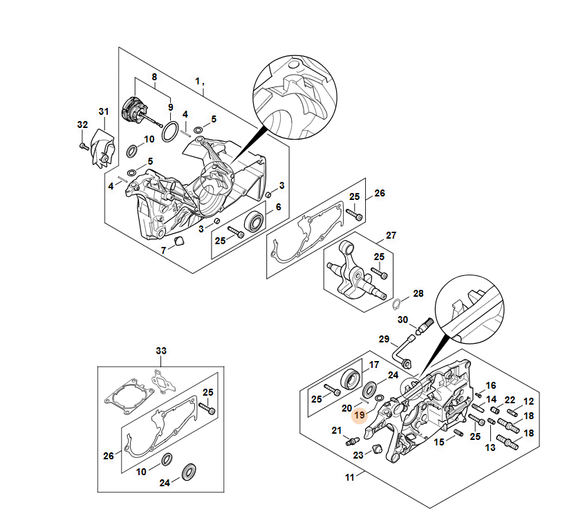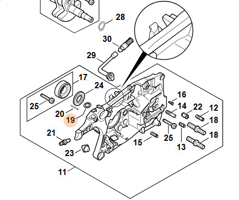 Pri generálnej oprave kľukovej skrine na STIHL MS 462 vždy skontrolujte stav púzdra (pozícia 19). Ak zistíte, že púzdro je v odliatku voľné alebo vykazuje známky oválnosti, je nevyhnutné ho vymeniť. Pri lisovaní nového púzdra odporúčam kľukovú skriňu rovnomerne nahriať, aby sa otvor mierne roztiahol, čo umožní osadenie púzdra bez rizika vzniku mikroprasklín v magnéziovom karteri. Správne osadené púzdro je základom pre to, aby Vaša píla po zložení fungovala s pôvodnou presnosťou.