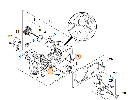 Pri každom polení kľukovej skrine na STIHL MS 462 dôkladne skontrolujte stav polohovacích púzdier na pozícii 3. Ak zistíte, že púzdro vykazuje známky oválnosti alebo je v odliatku voľné, okamžite ho vymeňte. Pri montáži nového púzdra odporúčam otvor v karteri jemne vyčistiť a púzdro osádzať pomocou vhodného priebojníka alebo lisu. Nikdy nepoužívajte nadmernú silu kladivom priamo na hranu púzdra, aby ste nedeformovali jeho priemer, čo by znemožnilo presné spojenie oboch polovíc skrine a ohrozilo tesnosť systému M-Tronic.