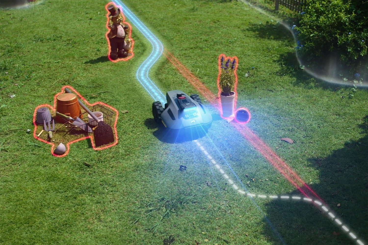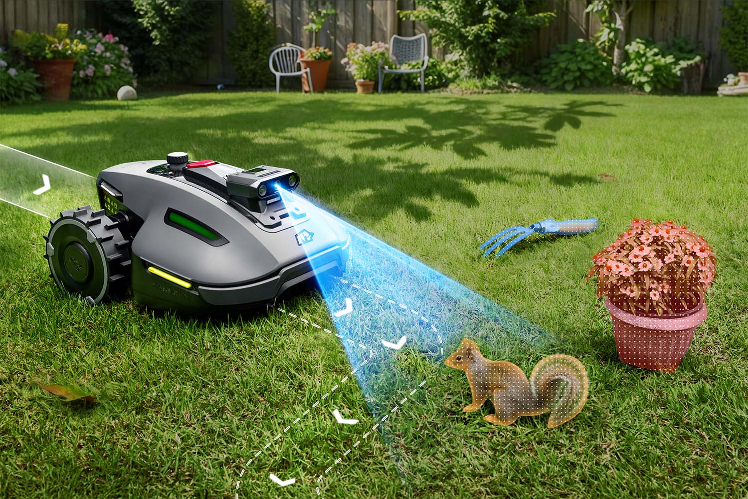✔️ Inteligentná ochrana majetku a zvierat: AI čip rozpoznáva viac ako 300 typov objektov. Kosačka bezpečne obíde zabudnutú hračku, spiaceho domáceho miláčika alebo záhradný nábytok bez jediného dotyku.