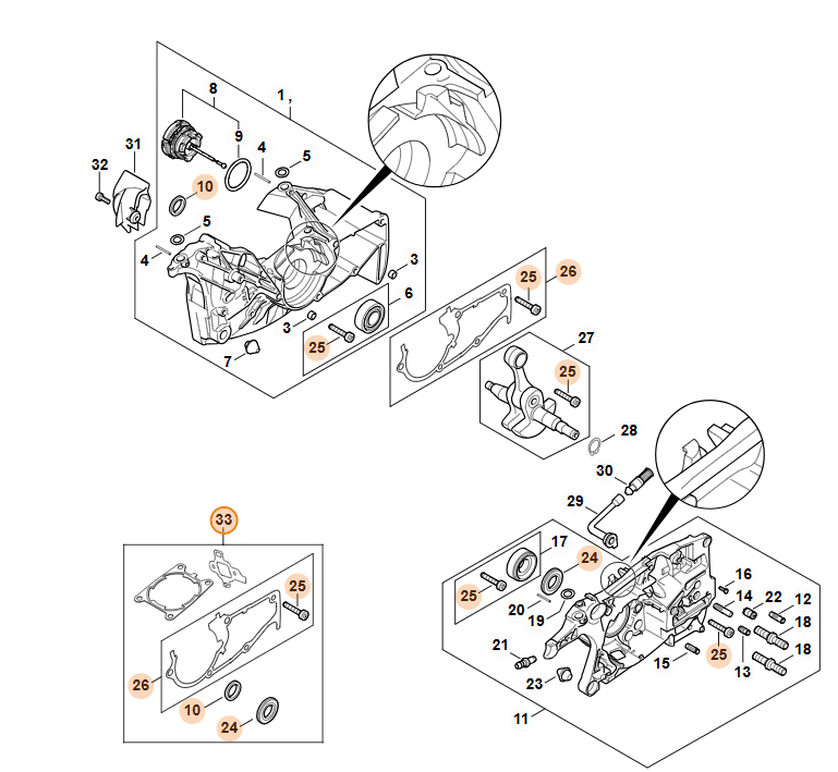 ✅ Pri profesionálnej oprave sa odporúča preveriť celkovú tesnosť. Ak už máte pílu rozobratú, tesnenie kľukovej skrine je namáhané rovnako ako tesnenie pod valcom. Výmena celej sady je poistkou, že motor bude po zložení fungovať ako nový bez rizika prisávania falošného vzduchu.